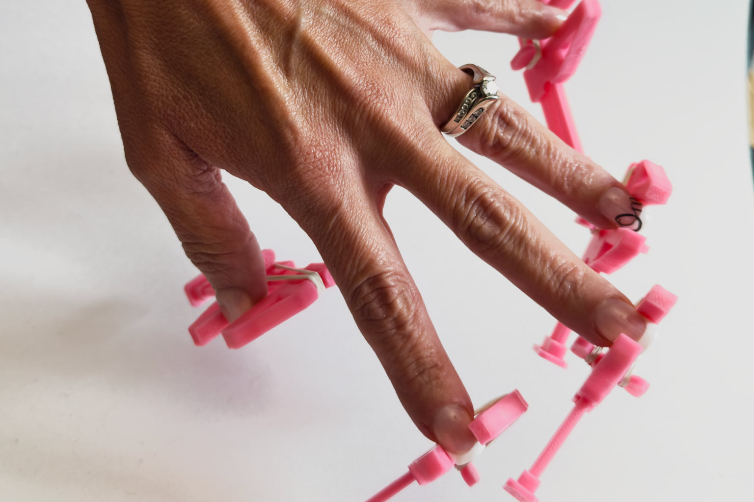 Nail technicians use this tool during dip powder manicures to gently bend the nail into a smooth, natural curve. The tool is placed on each finger and adjusted with a rubber band to apply the right amount of tension. This ensures a consistent shape across all nails, giving clients a polished, salon-quality finish.